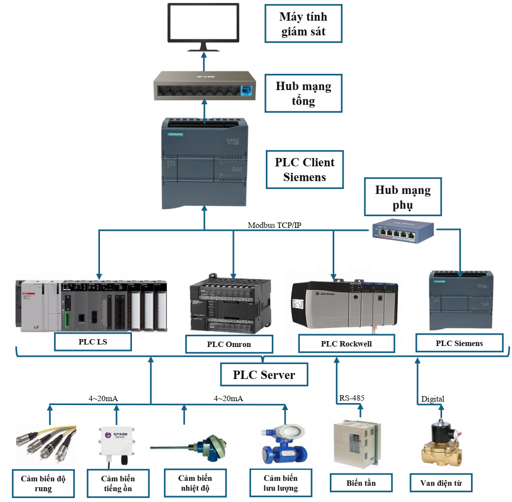 Các kỹ sư An Phát đã lắp đặt thêm một PLC Client thu thập dữ liệu của các thông số ở các khu vực trong nhà máy thông qua các trạm PLC Server có sẵn trong nhà máy nhằm mục đích tổng hợp và dễ dàng xử lý và can thiệp vào các thông số. Sử dụng OPC Client đưa dữ liệu về xử lý trên phần mềm giám sát được An Phát thiết kế dựa trên nền tảng C#(WPF). Đối với các thông số mới được bổ sung, các kỹ sư An Phát đã lắp đặt thêm cảm biến mới, các tín hiệu từ cảm biến được đưa về trạm PLC S7-1200 của Siemens, thông qua thư viện S7.Net Library kết nối Kết nối C# với PLC S7-1200.