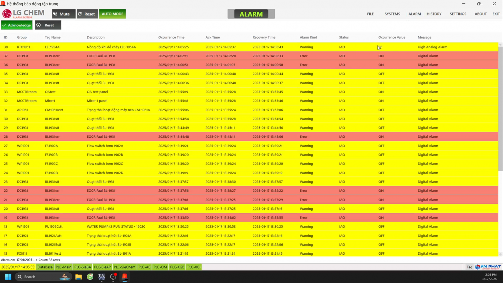 - Màn hình báo cáo lỗi (Alarm) Đây là màn hình gần như quan trọng nhất của hệ thống giám sát. Tại màn hình này được chia các cột thông số như sau: