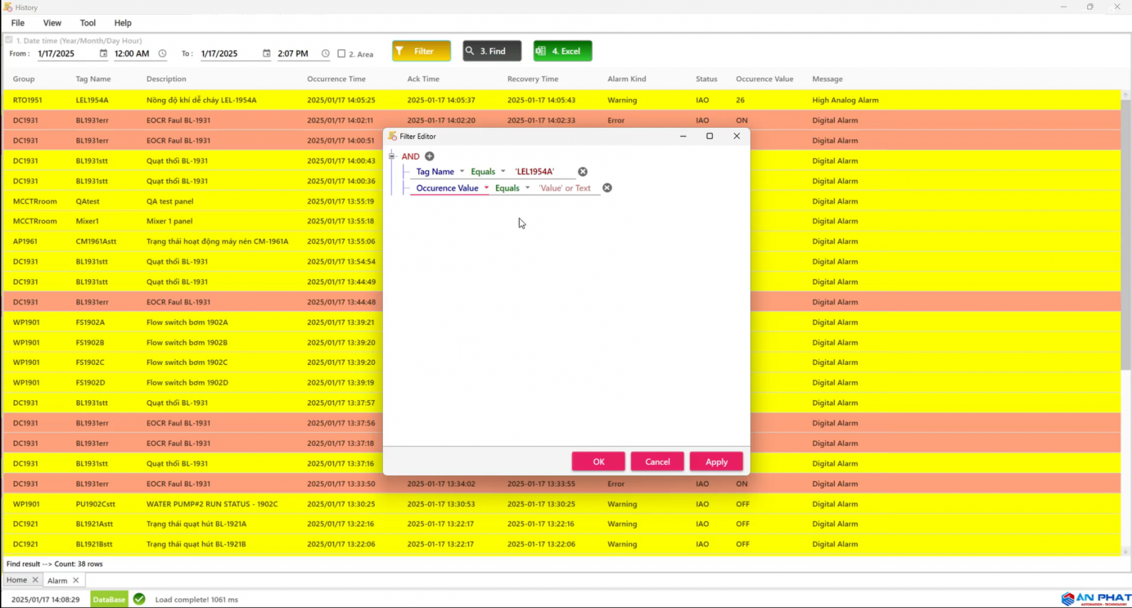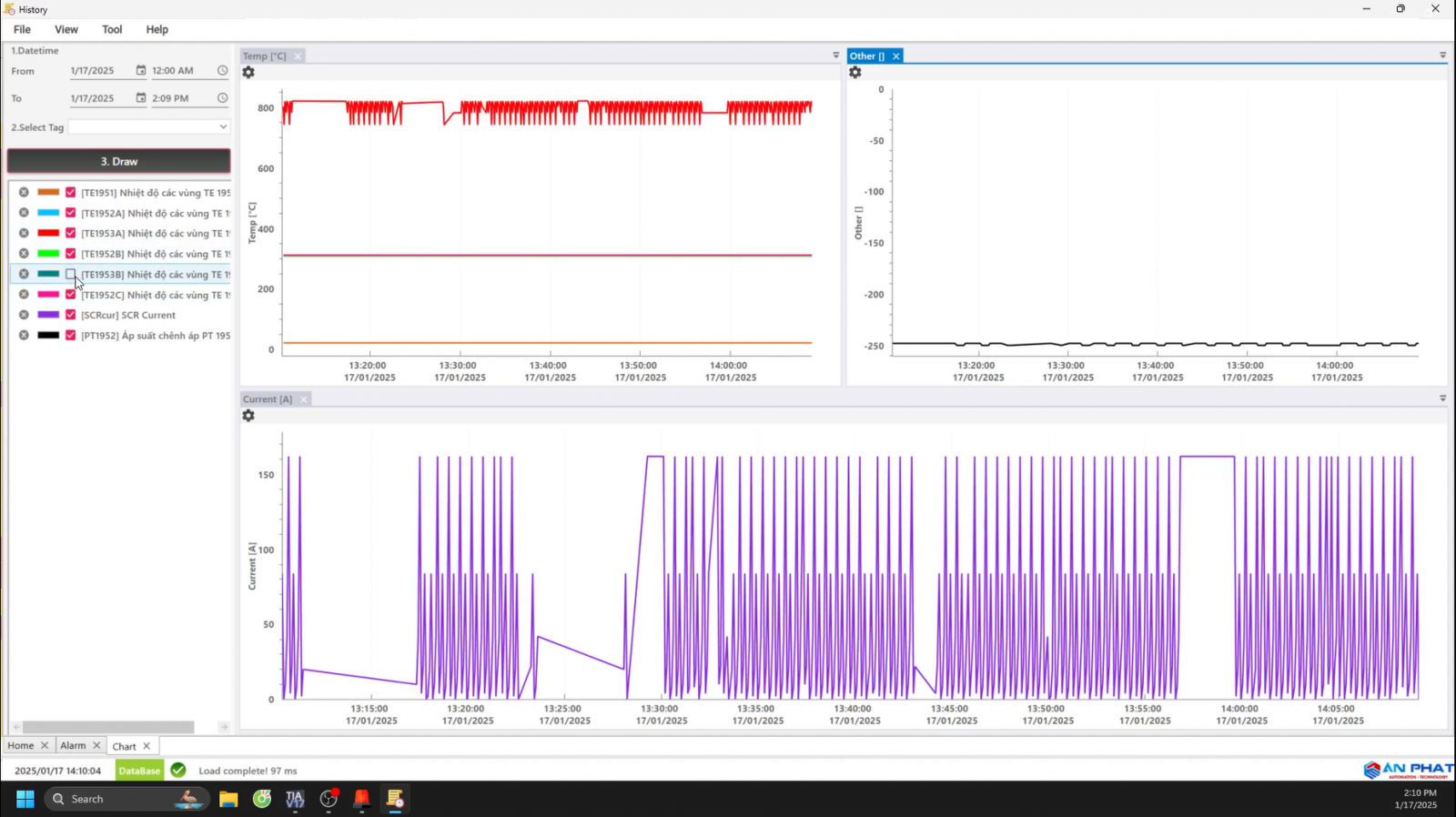 Tại giao diện này, phần lịch sử sẽ được tích hợp các công cụ lọc, tìm kiếm, vẽ đồ thị. Tất cả các tín hiệu analog được ghi lại có thể vẽ dưới dạng đồ thị với tùy chọn chỉnh sửa màu sắc trực quan đơn giản, dễ sử dụng.